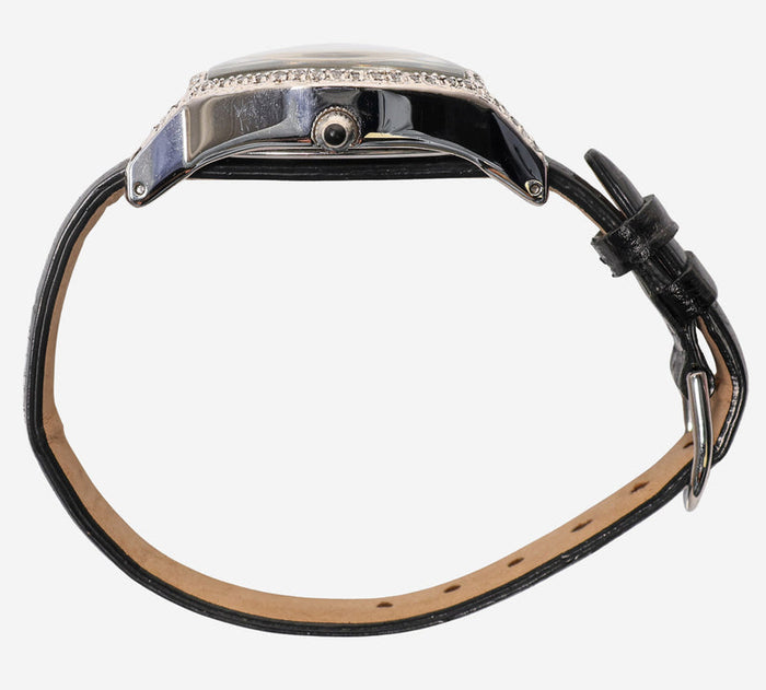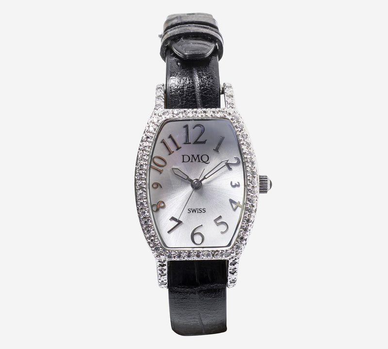 This pre-owned DMQ watch is in Excellent condition featuring Quartz Analog movement, with a Silver case and a Black Leather 6.5 inch band.