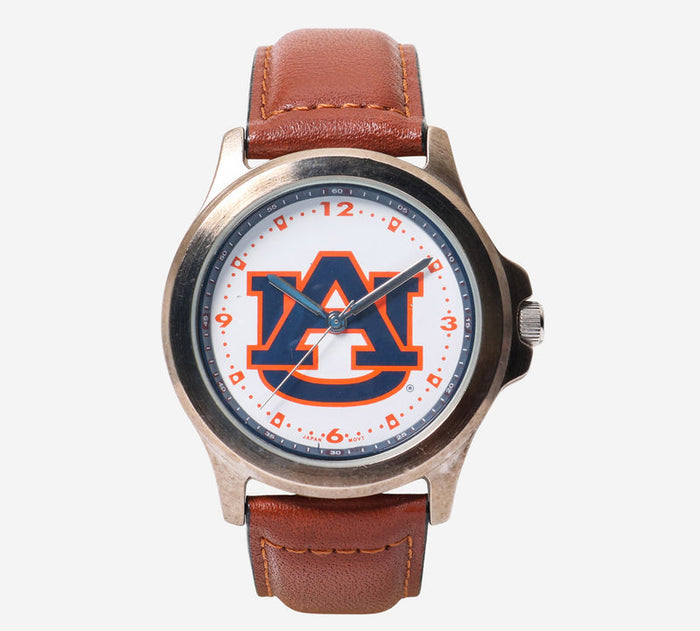 This pre-owned Auburn Tigers watch is in Good condition featuring Quartz Analog movement, with a Gold case and a Brown Leather 7 inch band.