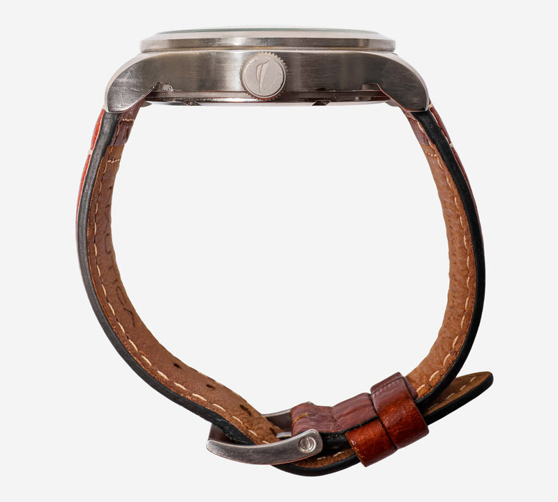 This pre-owned Nautica watch is in Excellent condition featuring Quartz Analog movement, with a Silver case and a Brown Leather 7 inch band.