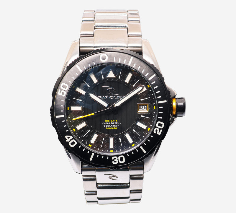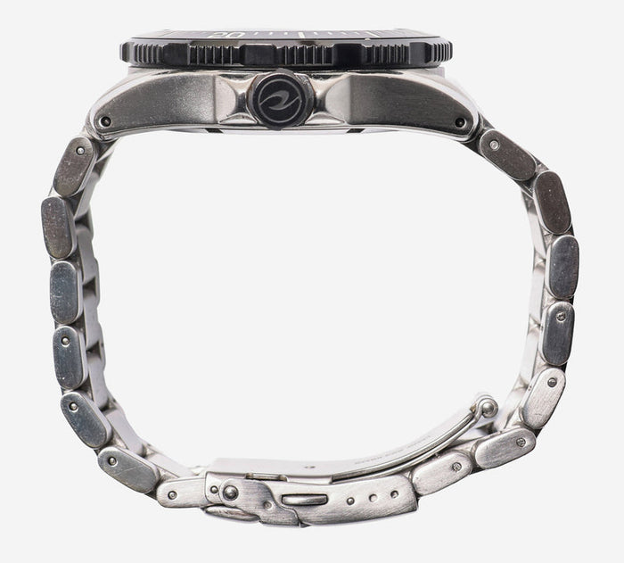 This pre-owned Rip Curl watch is in Excellent condition featuring Quartz Analog movement, with a Black case and a Silver Metal 7 inch band 45mm
