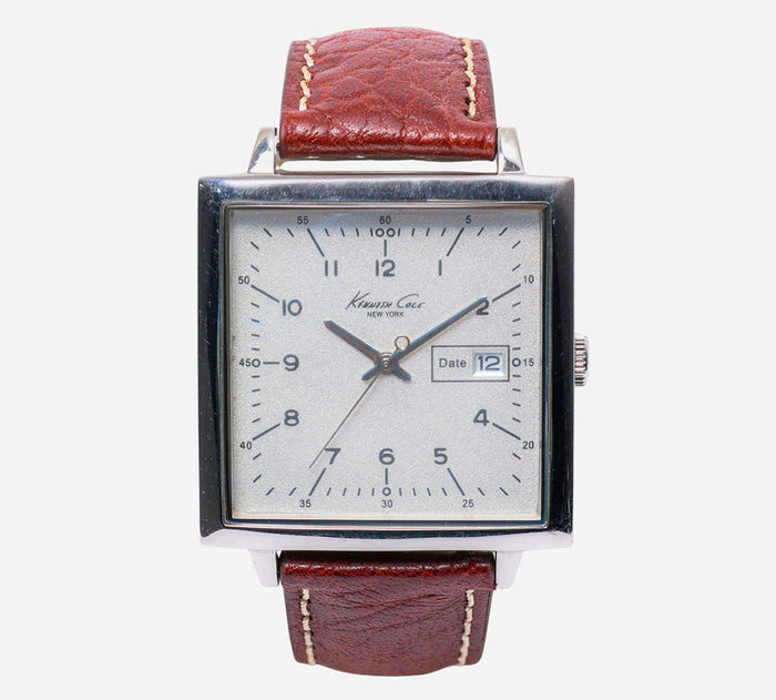 This pre-owned Kenneth Cole watch is in Good condition featuring Quartz Analog movement, with a Silver case and a Brown Leather 7 inch band 35mm