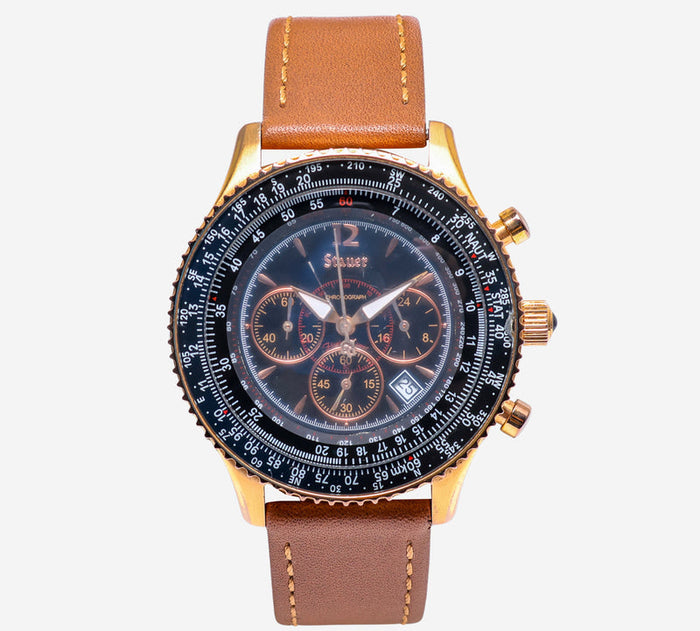 This pre-owned Stauer watch is in Good condition featuring Quartz Analog movement, with a Gold case and a Brown Leather 7 inch band 40mm