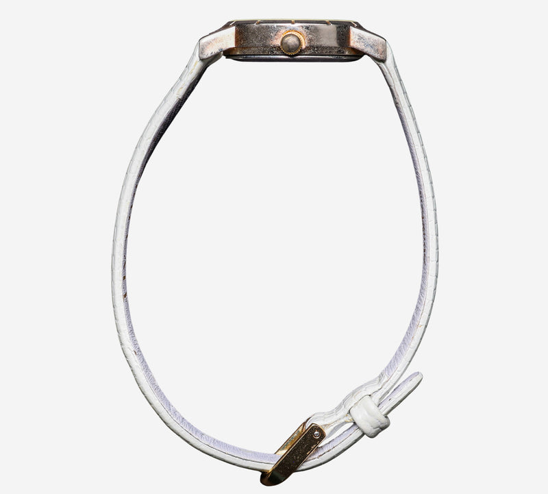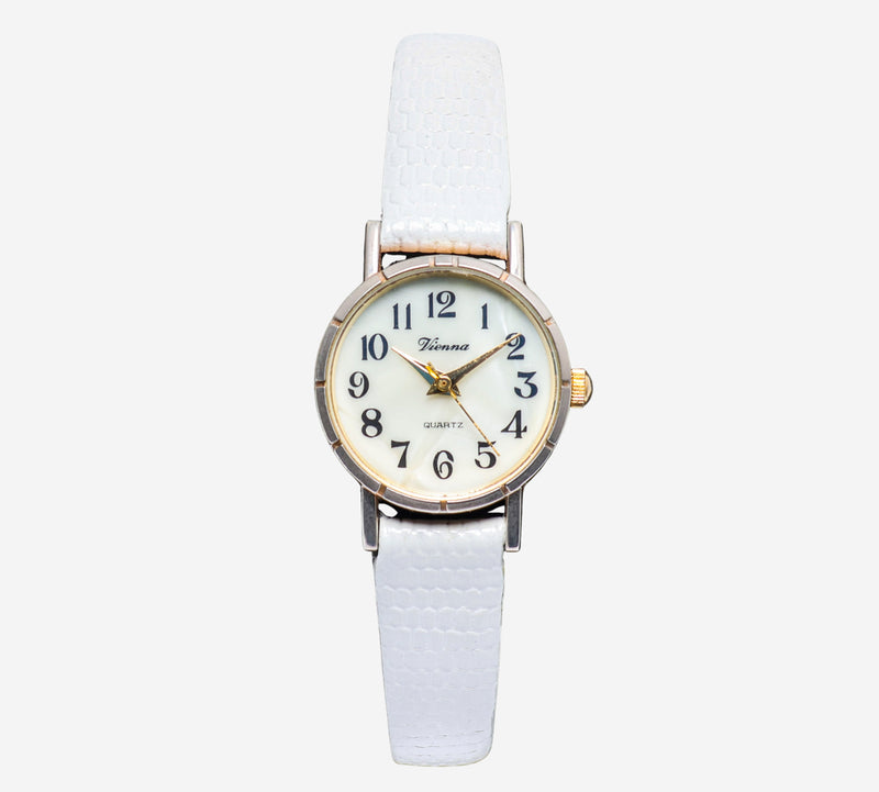 This pre-owned Vienna watch is in Good condition featuring Quartz Analog movement, with a Silver case and a White Leather 7 inch band 20mm