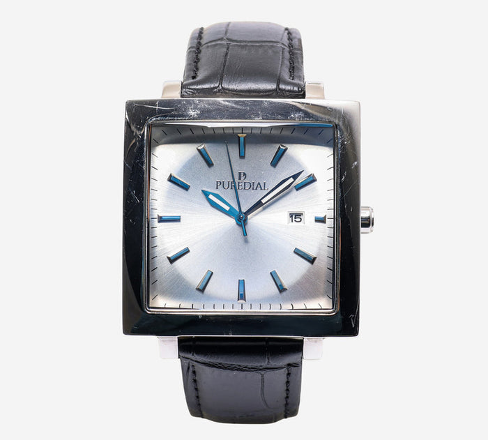 This pre-owned Puredial watch is in Excellent condition featuring Quartz Analog movement, with a Silver case and a Black Leather 7 inch band 40mm