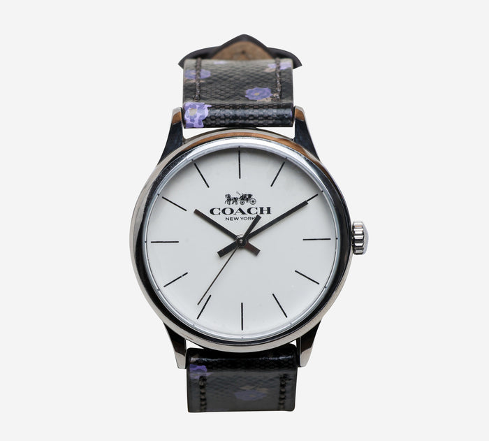 This pre-owned Coach watch is in Excellent condition featuring Quartz Analog movement, with a Silver Case and a Flowers Leather band. Own a piece of watchmaking history and give this watch a second life. All watch movements and batteries have been tested and operate as intended. No battery included for D5quartz watches. We cannot guarantee water resistance ratings are intact.