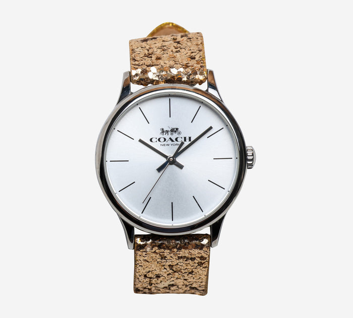 This pre-owned Coach watch is in Excellent condition featuring Quartz Analog movement, with a Silver Case and a Gold Leather band. Own a piece of watchmaking history and give this watch a second life. All watch movements and batteries have been tested and operate as intended. No battery included for D5quartz watches. We cannot guarantee water resistance ratings are intact.