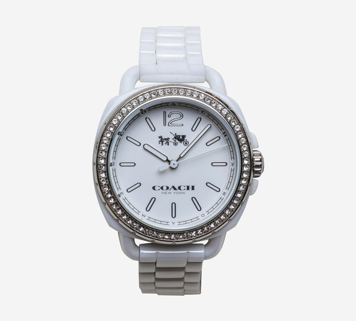 This pre-owned Coach watch is in Excellent condition featuring Quartz Analog movement, with a Silver Case and a White Plastic band. Own a piece of watchmaking history and give this watch a second life. All watch movements and batteries have been tested and operate as intended. No battery included for D5quartz watches. We cannot guarantee water resistance ratings are intact.