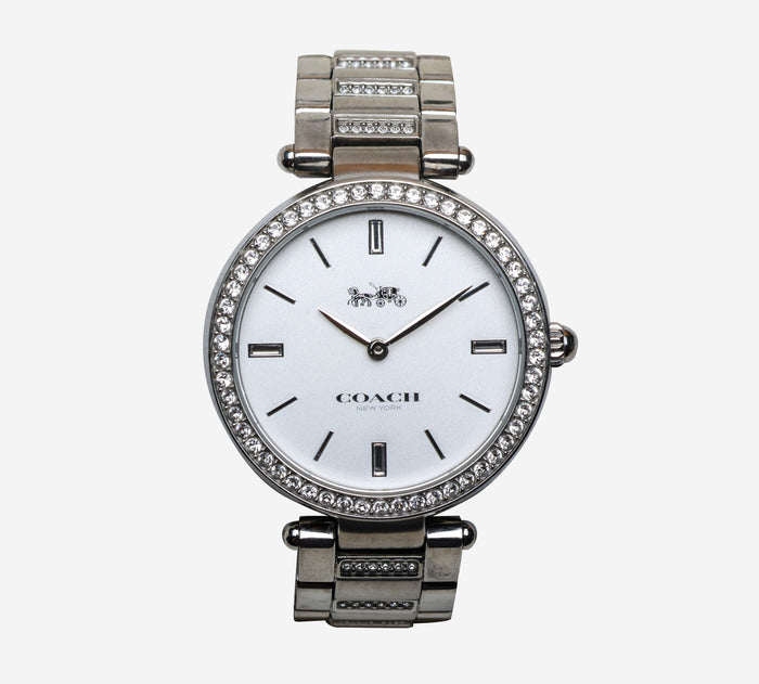 This pre-owned Coach watch is in Excellent condition featuring Quartz Analog movement, with a Silver Case and a Silver Metal band. Own a piece of watchmaking history and give this watch a second life. All watch movements and batteries have been tested and operate as intended. No battery included for D5quartz watches. We cannot guarantee water resistance ratings are intact.