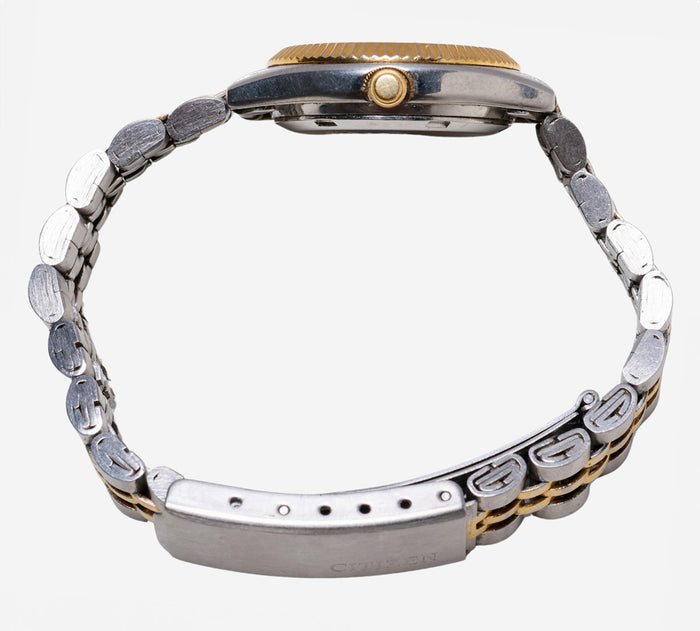 This pre-owned watch is in Good condition featuring a Gold Case, Silver and Gold Metal Bracelet, and Quartz Analog movement.
