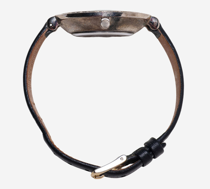 This pre-owned watch is in Excellent condition featuring a Silver Diamond Case, Black Leather and Quartz Analog movement. This watch has a soul and a story to be told, continue its legacy with a second life.