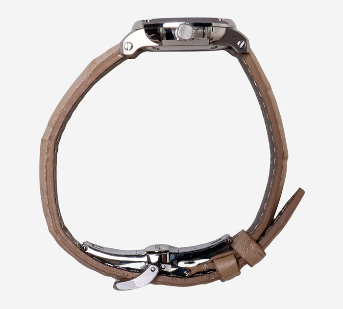 This pre-owned watch is in Excellent condition featuring a Silver Case, Sand Leather, and Quartz Analog movement. This watch has a soul and a story to be told, continue its legacy with a second life.