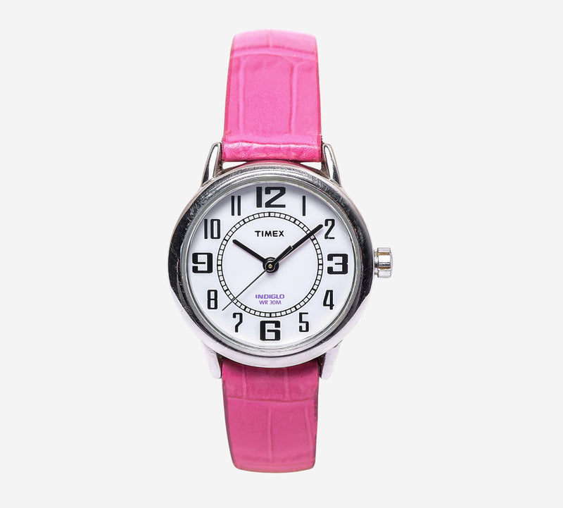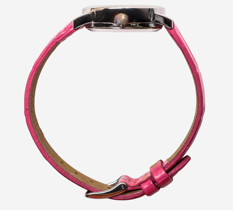 This pre-owned Timex watch is in Excellent condition featuring Quartz Analog movement, with a Silver case and a Pink Leather 6.5 inch band. 25mm