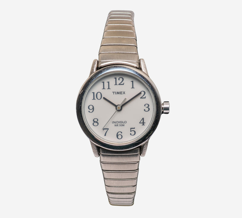 This pre-owned Timex watch is in Good condition featuring Quartz Analog movement, with a Gold case and a Silver Resin 6 inch band. 25mm