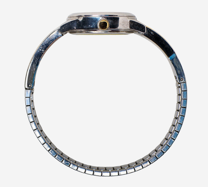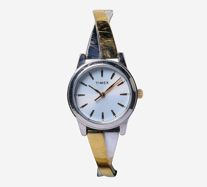 This pre-owned Timex watch is in Good condition featuring Quartz Analog movement, with a Silver case and a Gold and Silver Metal 6.5 inch band. Own a piece of watchmaking history and give this watch a second life. All watch movements and batteries have been tested and operate as intended. No battery included for D5quartz watches. We cannot guarantee water resistance ratings are intact.