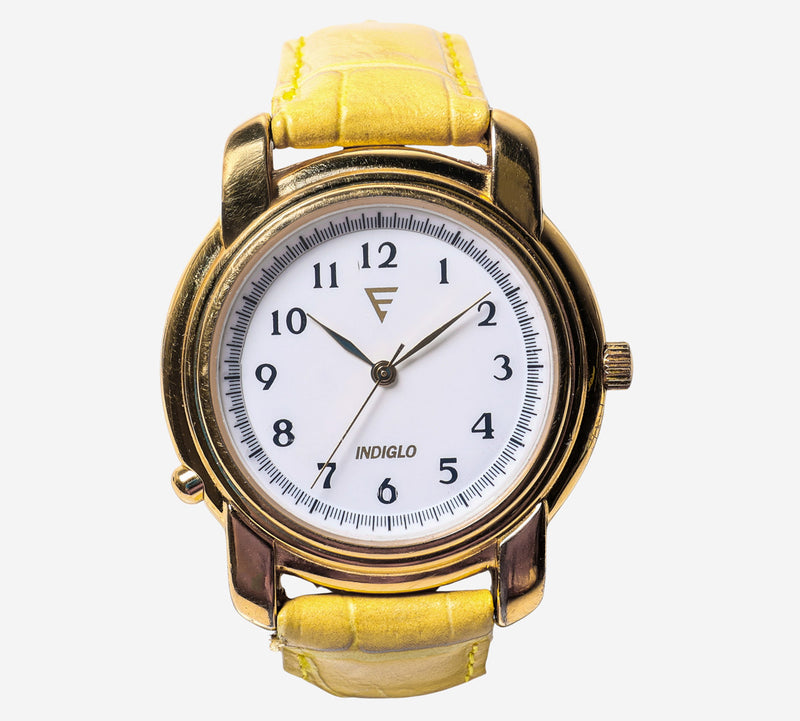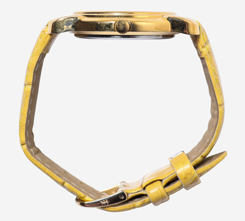 This pre-owned Timex watch is in Good condition featuring Quartz Analog movement, with a Gold case and a Yellow Leather 7 inch band.