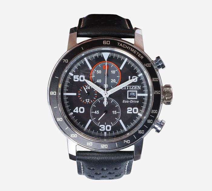 This pre-owned Citizen watch is in Excellent condition featuring Quartz Analog movement, with a Black case and a Black Leather 7 inch band 40mm