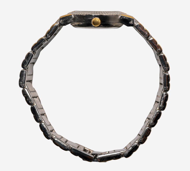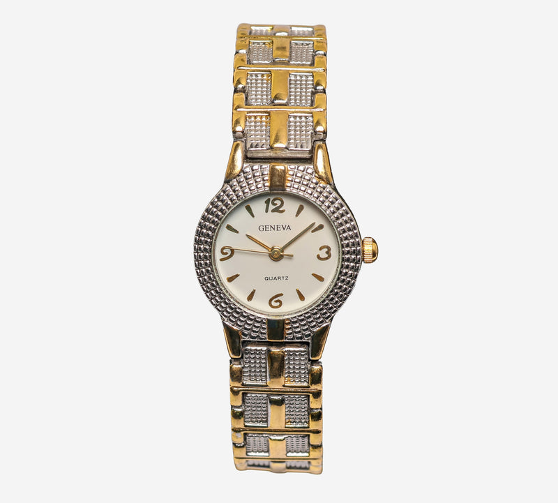 This pre-owned Geneva watch is in Excellent condition featuring Quartz Analog movement, with a Silver case and a Silver and Gold Fabric 6 inch band. 25mm