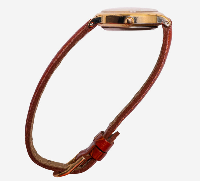 This pre-owned Disney watch is in Excellent condition featuring Quartz Analog movement, with a Gold case and a Brown Resin 7 inch band. 25mm