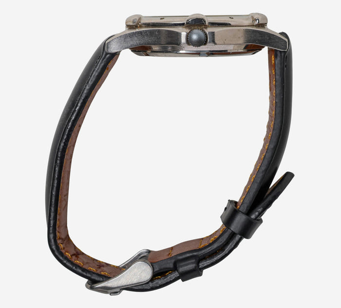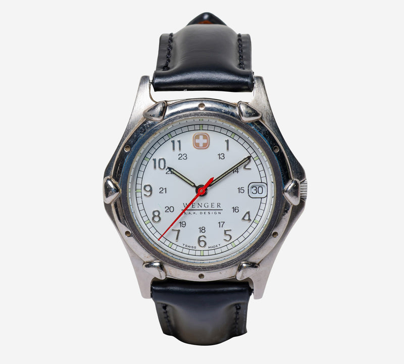 This pre-owned Wenger watch is in Excellent condition featuring Quartz Analog movement, with a Silver case and a Black Leather 7 inch band. 35mm