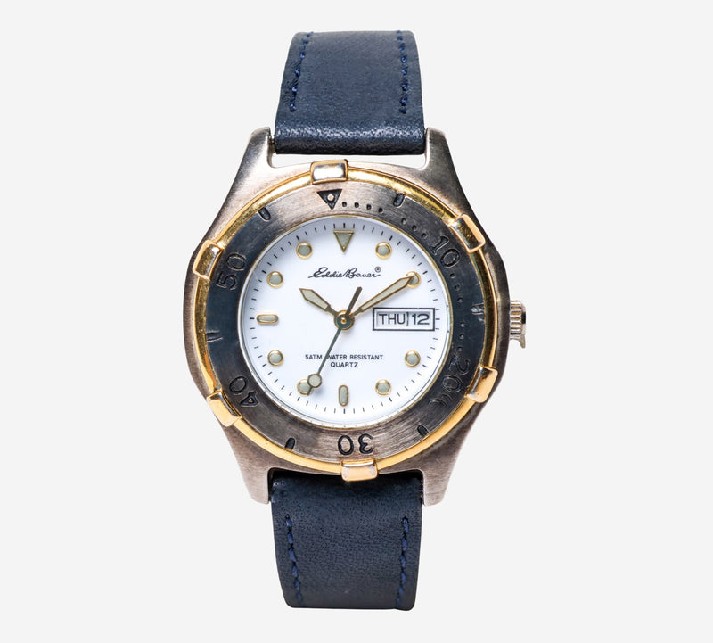 This pre-owned Eddie Bauer watch is in Good condition featuring Quartz Analog movement, with a Gold case and a Black Metal 5.5 inch band. 30mm