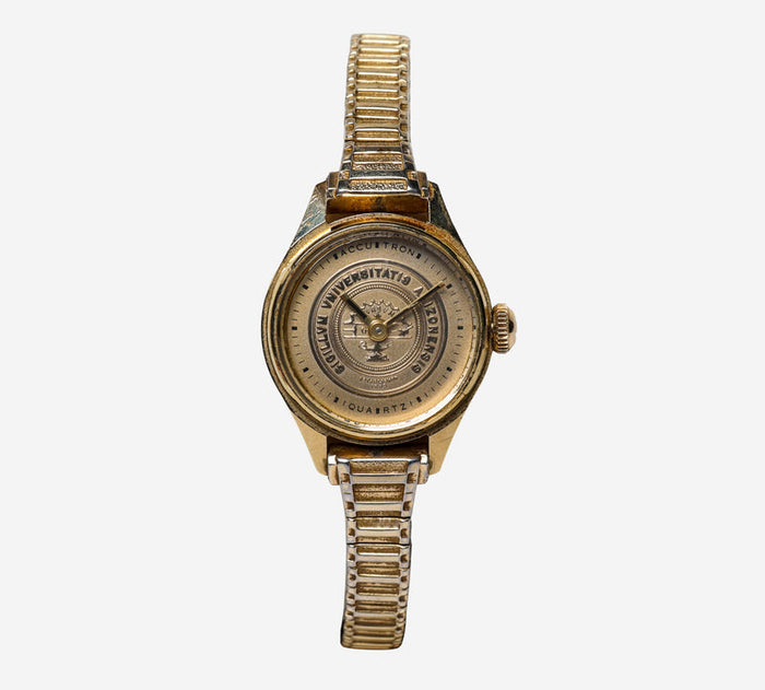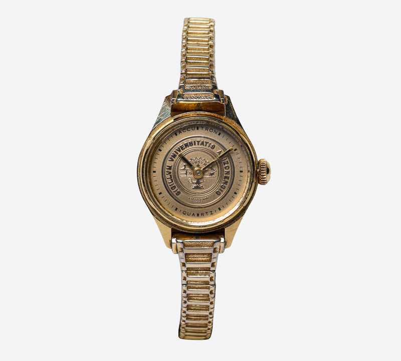 This pre-owned Bulova watch is in Excellent condition featuring Quartz Analog movement, with a Gold case and a Gold Plastic 6 inch band. 25mm