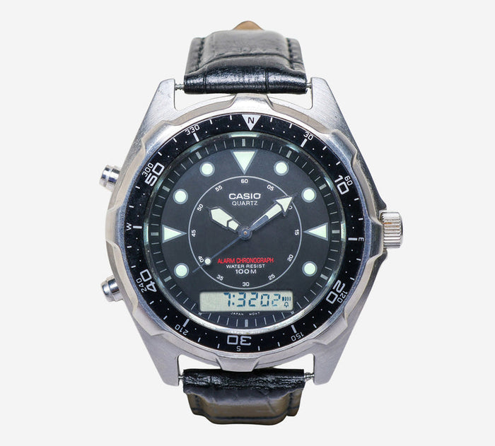 This pre-owned Casio watch is in Good condition featuring Quartz Analog Quartz Digital movement, with a Silver case and a Black Metal 7 inch band.