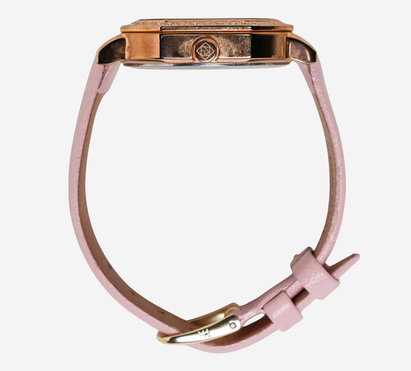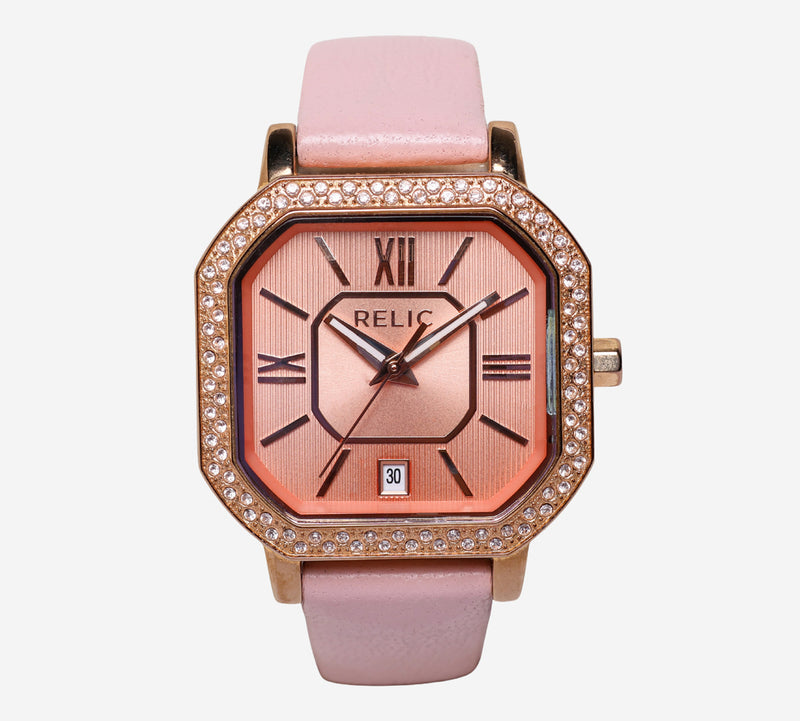 This pre-owned Relic watch is in Good condition featuring Quartz Analog movement, with a Gold case and a Pink Metal 7 inch band.