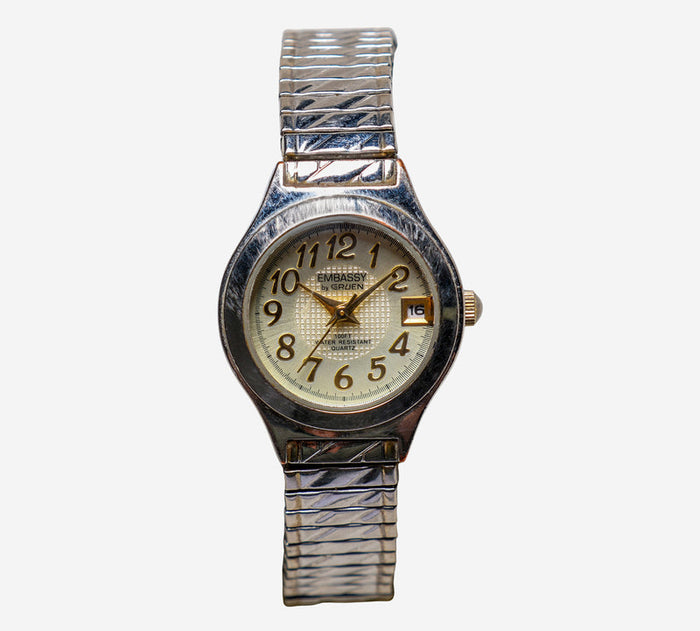 This pre-owned Embassy watch is in Good condition featuring Quartz Analog movement, with a Silver case and a Silver Metal 6 inch band. Own a piece of watchmaking history and give this watch a second life. All watch movements and batteries have been tested and operate as intended. No battery included for D5quartz watches. We cannot guarantee water resistance ratings are intact.