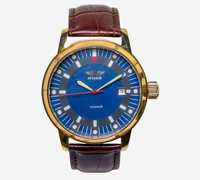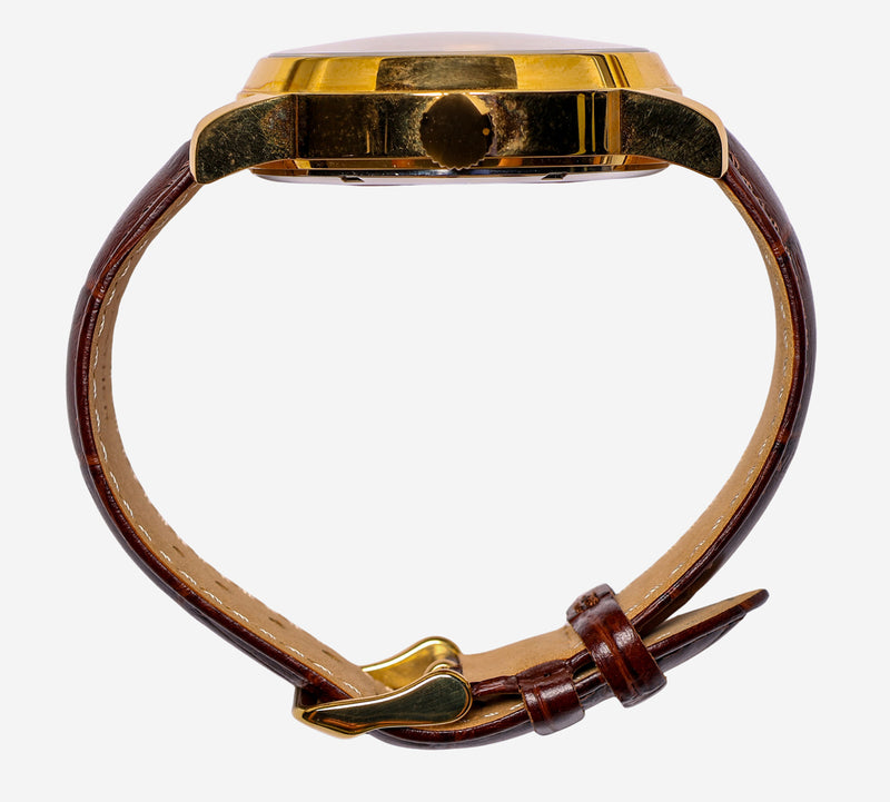 This pre-owned Aviator watch is in Excellent condition featuring Mechanical movement, with a Gold case and a Brown Leather 7 inch band. Own a piece of watchmaking history and give this watch a second life. All watch movements and batteries have been tested and operate as intended. No battery included for D5quartz watches. We cannot guarantee water resistance ratings are intact.