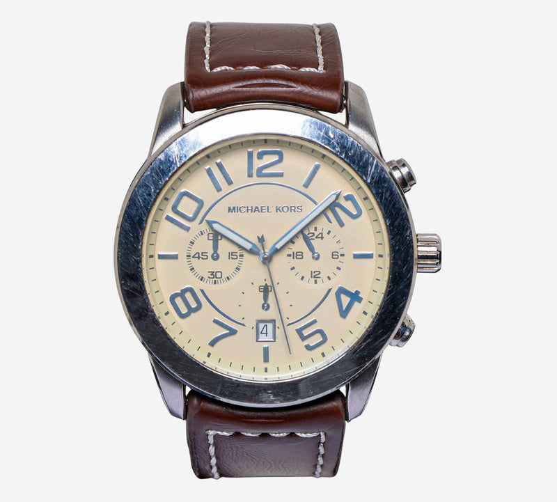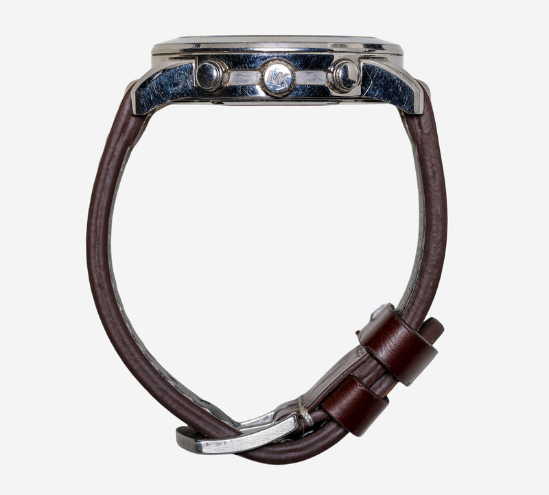 This pre-owned Michael Kors watch is in Good condition featuring Quartz Analog movement, with a Silver case and a Brown Leather 7 inch band. Own a piece of watchmaking history and give this watch a second life. All watch movements and batteries have been tested and operate as intended. No battery included for D5quartz watches. We cannot guarantee water resistance ratings are intact.