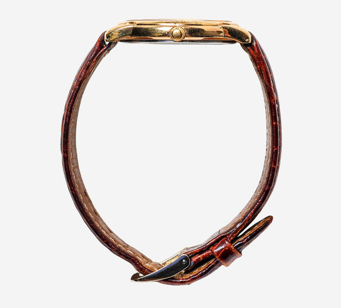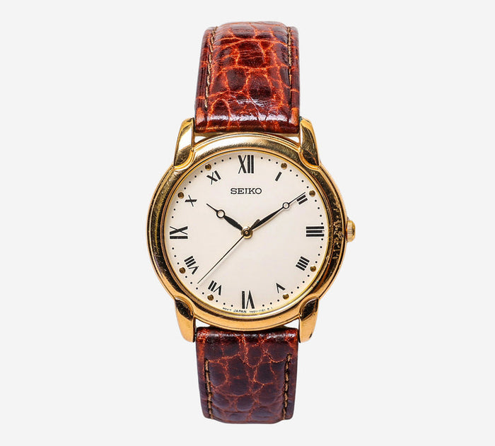 This pre-owned Seiko watch is in Good condition featuring Quartz Analog movement, with a Gold case and a Brown Leather 7 inch band. Own a piece of watchmaking history and give this watch a second life. All watch movements and batteries have been tested and operate as intended. No battery included for D5quartz watches. We cannot guarantee water resistance ratings are intact.