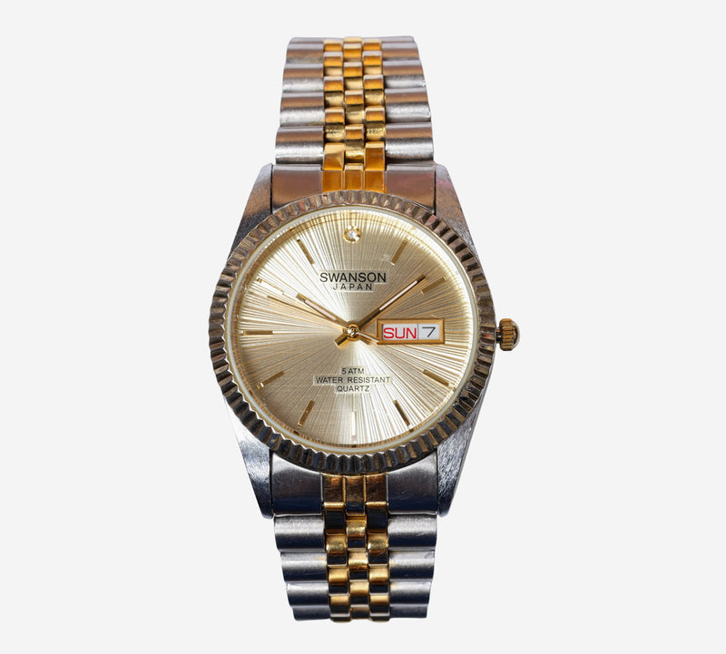 This pre-owned Swanson watch is in Good condition featuring Quartz Analog movement, with a Gold case and a Gold and Silver Metal 7 inch band 35mm