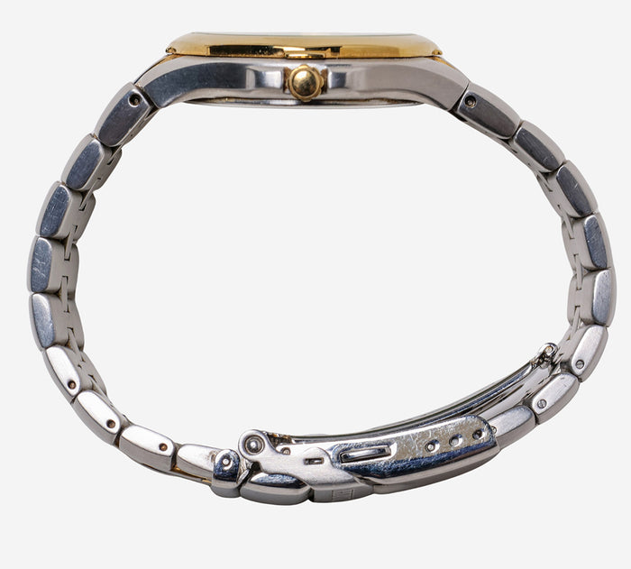 This pre-owned watch is in Excellent condition featuring a Gold Case, a Silver and Gold Metal Bracelet and Quartz Analog movement.